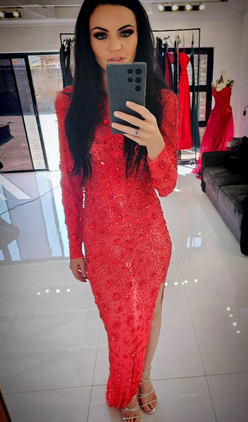 Red transparent rhinestone long sleeve dress with slit.